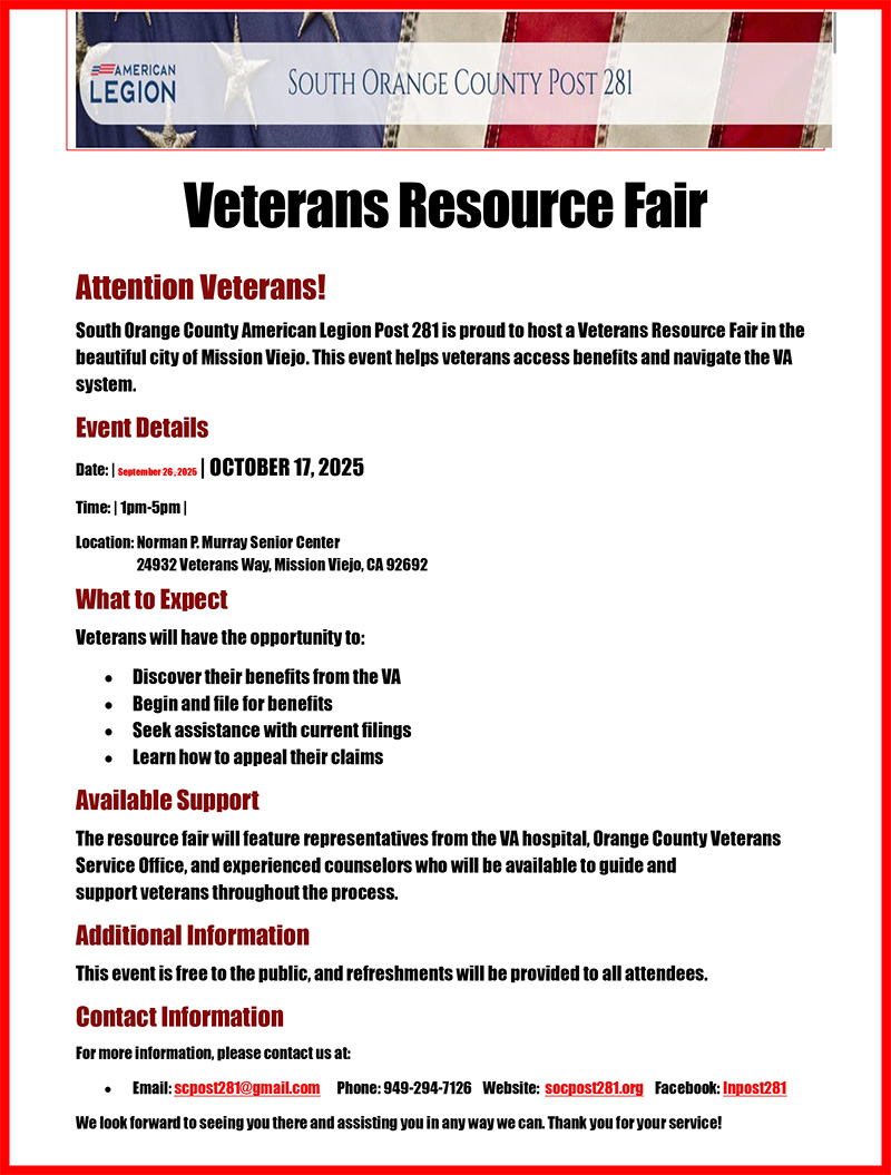 South Orange County Post 281 of the American Legion is dedicated to supporting veterans in the South Orange County areas of Aliso Viejo, Coto de Caza, Dana Point, Foothill Ranch, Ladera Ranch, Laguna Hills, Laguna Niguel, Lake Forest, Mission Viejo, Portola Hills, Rancho Santa Margarita and Trubucco Canyon.